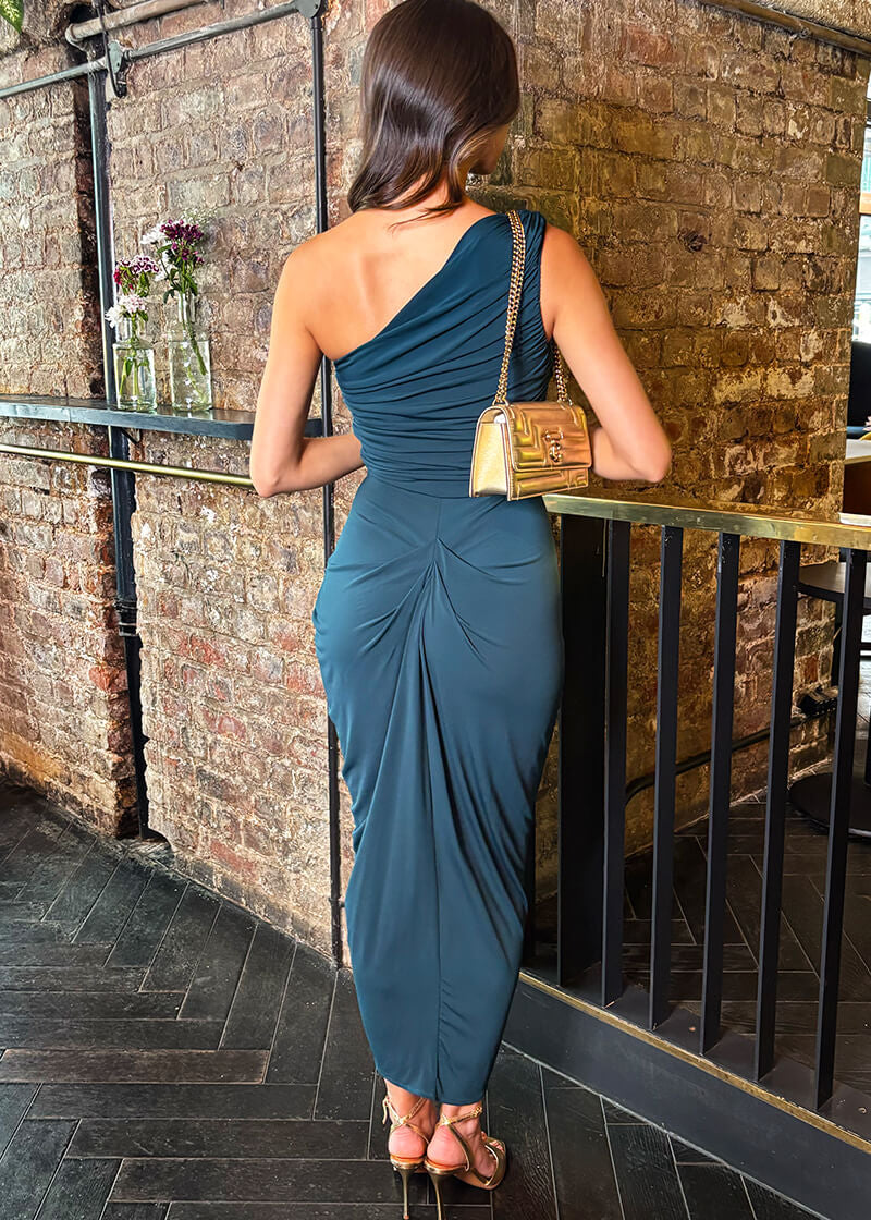 Jeśli masz przed sobą wyjątkową okazję, sięgnij po naszą ciemnoturkusową sukienkę midi na jedno ramię z marszczoną spódnicą. Wykonana z wysokiej jakości elastycznej dzianiny z podszewką, wyróżnia się dopasowaną do sylwetki formą, marszczoną górą z efektownym, asymetrycznym ramiączkiem, spódnicą midi z marszczeniem z boku oraz bocznym zapięciem na zamek. Połącz ją z wyrazistymi szpilkami, pasującą torebką i ulubionymi dodatkami, aby stworzyć olśniewający wieczorowy look!