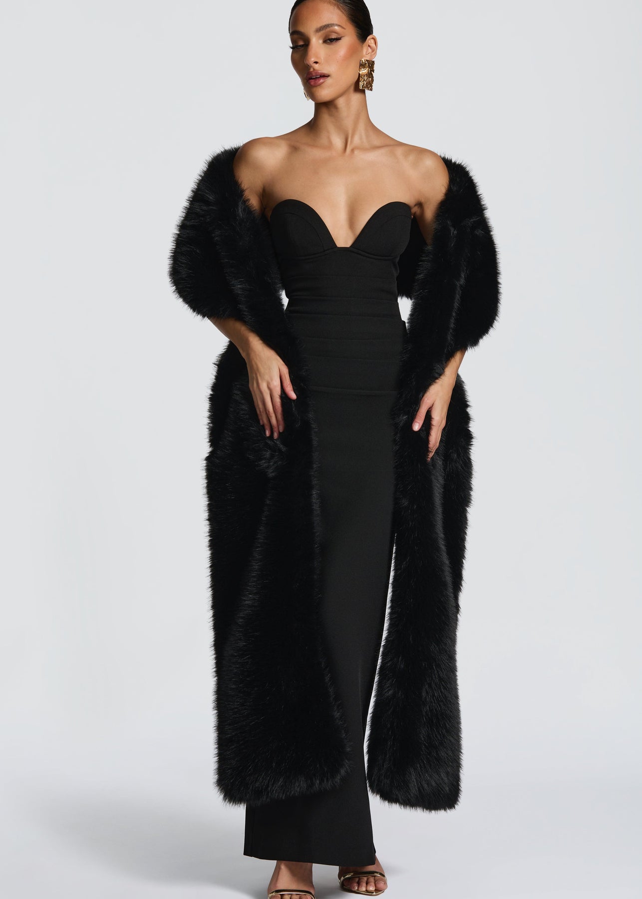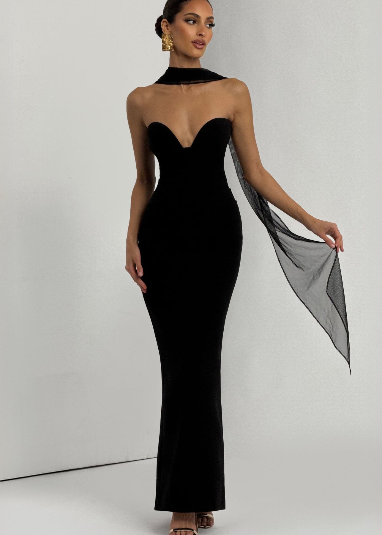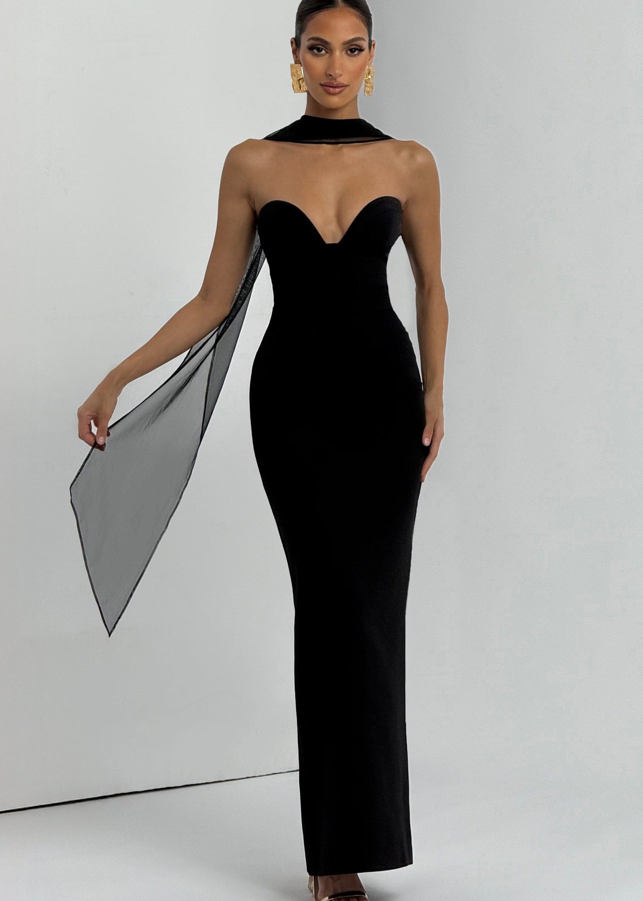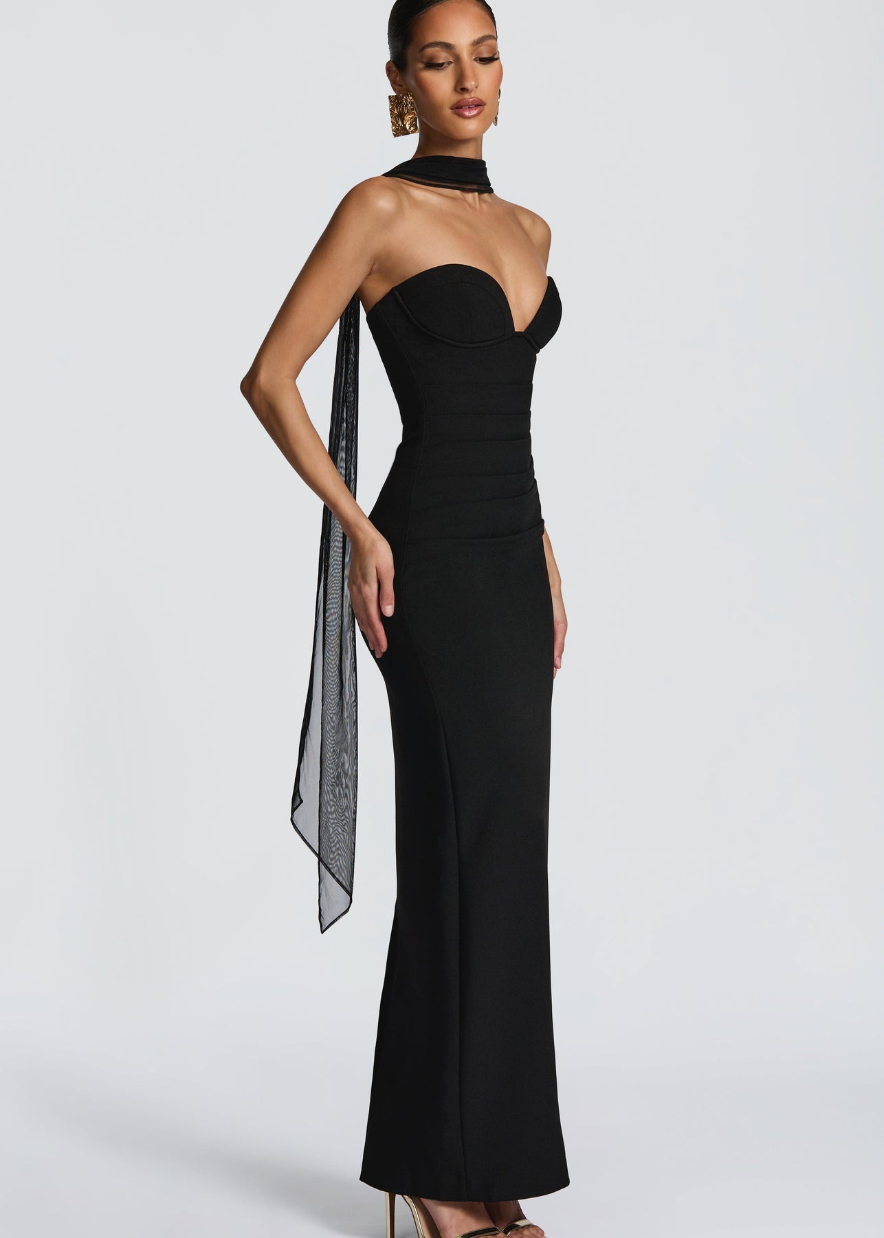Sukienka Beaibiza w kolorze czarnym posiada bezramkowy dekolt w formie miseczek z fiszbinami oraz lekko wyściełane miseczki dla wsparcia i elegancji. Wykonana z nieelastycznego krepowego materiału, oferuje wyrafinowaną sylwetkę typu kolumna, z marszczeniem w talii i rozcięciem z tyłu dla swobodnego ruchu.